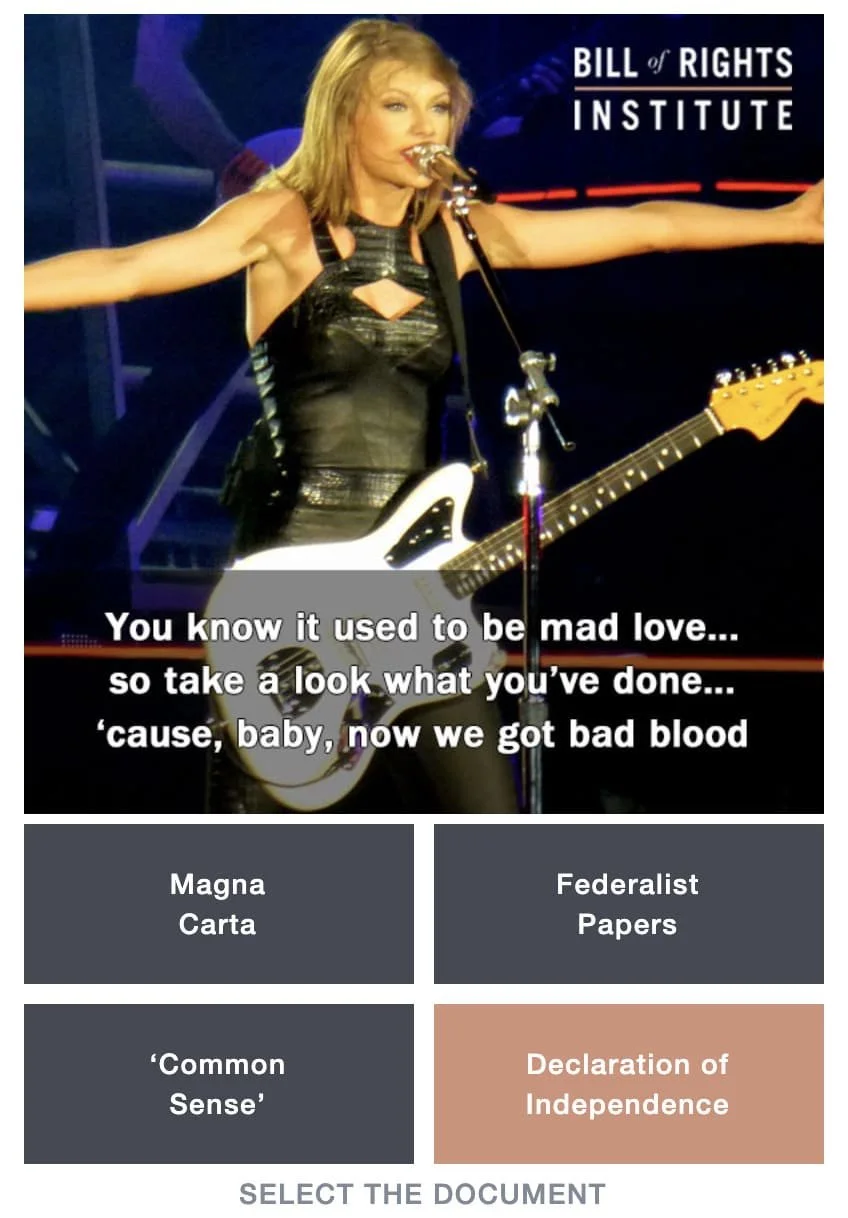 As a pioneering advertising agency, my former employer Red Edge became one of the first firms to leverage Instagram advertising. It was the solution to a practical challenge: how do you grab the attention of high school students? The entrée was reaching high school history and civics students, as we cut through the clutter with a web-based interactive quiz website, SwiftYourRights.com and promoted on Instagram